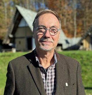 Autor Dr. Thomas Fritsch vor der Kulisse des Keltendorfs am Fuß des Ringwalls von Otzenhausen