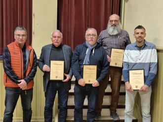 v. l. Christoph Berend (1. Vorsitzender), Thomas Biehl und Mathias Druglat für 40 Jahre, Eberhard Stumm für 50 Jahre und Florian Walg für 25 Jahre. Auf diesem Wege nochmals herzlichen Glückwunsch.