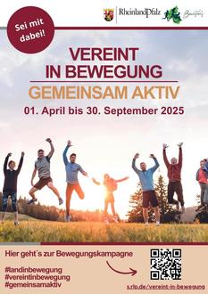 Nach der erfolgreichen Bewegungskampagne im vergangenen Jahr startet die Landesregierung am 1. April 2025 eine neue Bewegungskampagne im Rahmen der Landesinitiative „Rheinland-Pfalz - Land in Bewegung“. Unter dem Motto „Vereint in Bewegung - gemeinsam aktiv“ sind erstmals neben den rund 5.800 Sportvereinen auch die mehr als 32.000 anderen Vereine, dazu gemeinnützige Organisationen und öffentliche Einrichtungen in Rheinland-Pfalz dazu aufgerufen, im Zeitraum vom 1. April 2025 bis zum 30. September 2025 für alle Menschen leicht zugängliche und kostenfreie Bewegungs- und Sportangebote anzubieten.