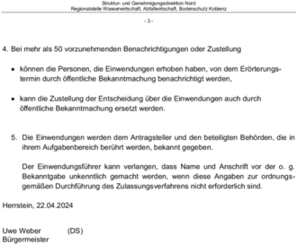 | Diese Einwendungen müssen also bis spätestens 28.06.2024 einschließlich entweder bei der unter Nr. 1 genannten Behörde oder bei der Struktur- und Genehmigungsdirektion Nord, Regionalstelle Wasserwirtschaft, Abfallwirtschaft, Bodenschutz Koblenz, Stresemannstraße 3-5, 56068 Koblenz, erhoben werden. | |