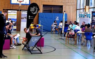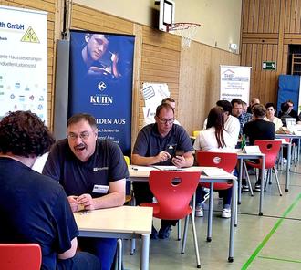 Am 15. Juni 2023 fand in der Turnhalle der IGS Herrstein-Rhaunen am Standort Herrstein zum ersten Mal das „Azubi-Speed-Dating“ statt. Das Konzept ist einfach: Schüler*innen und Unternehmen haben zehn Minuten Zeit, sich kennenzulernen und über eine gemeinsame Zukunft, beispielsweise über ein Praktikum oder einen Ausbildungsplatz, zu sprechen. Dann geht es weiter zum nächsten "Date” mit dem nächsten Unternehmen.