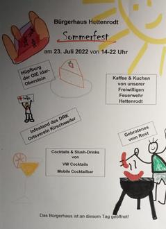 Am 23.07.2022 veranstalten die Pächter des Bürgerhauses in Hettenrodt ein Sommerfest. Ab 14 Uhr bietet Familie Arend in Zusammenarbeit mit der Freiwilligen Feuerwehr Hettenrodt Kaffee und Kuchen an. An einem Infostand des DRK Ortsverein Kirschweiler kann man sich einen Überblick über die Aktivitäten der ehrenamtlichen Tätigen informieren. Für die Kinder wird eine Hüpfburg aufgebaut. Neben Gebratenem vom Rost werden unter anderem Cocktails und Slush-Drinks angeboten.