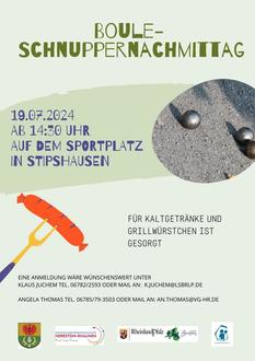 Das französische Kugelspiel ist leicht zu erlernen und die Bewegung an der frischen Luft fördert die Gesundheit und die Kommunikation. Die ca. zwei bis dreistündige Veranstaltung beginnt um 14.30 Uhr. Treffpunkt ist der Sportplatz in Stipshausen. Spielkugeln werden, soweit nicht vorhanden, zur Verfügung gestellt. Für das leibliche Wohl (Kaltgetränke, Grillwürste) ist gesorgt.