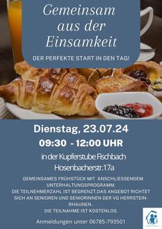 Die Gemeindeschwesternplus der VG Herrstein-Rhaunen laden am 23.07.2024 ab 9:30 Uhr - 12:00 Uhr zu einem kostenlosen gemeinsamen Frühstück mit anschließendem Unterhaltungsprogramm ein! Veranstaltungsort ist die Kupferstube in Fischbach, Hosenbachstr.17a.