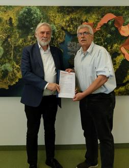 Staatssekretär Prof. Dr. Jürgen Hardeck (li.) nimmt die Petition, überreicht durch Bürgermeister Uwe Weber, Verbandsgemeinde Herrstein-Rhaunen, entgegen