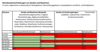 Die gleiche Nutzungsbeschränkung gilt ebenfalls für eine Vielzahl weiterer Geräte und Maschinen, z.B. Motorsägen, Motorhacke, Vertikutierer, Beton- u. Mörtelmischmaschinen, Kreissägen, Rüttelplatten etc..