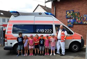 Im Rahmen des Vorschulprogramms erarbeiteten die Kinder mit Herrn Grünewald (DRK) und Frau Schaar (Kita) zuerst die verschiedensten Zweige des DRK. Danach durften die Kinder eine Kiste mit verschiedenen Materialien die im Rettungswagen eingesetzt werden, wie z.B. Spritzen, Armschiene, Atemgerät, Halskrause u.v.m. erkunden, und Herr Grünewald erklärte den jeweiligen Einsatz des ausgesuchten Teils. Im Anschluß durfte jedes Kind sein ausgesuchtes Teil behalten. Daraus wurde in den darauf folgenden Tagen mit den Kindern gemeinsam ein Plakat erstellt.