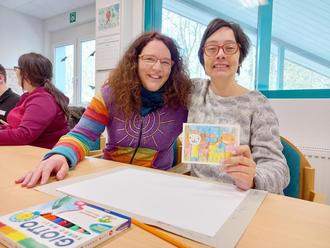 v.l.n.r. Eva Maria Bloem und Lisa Lanz in der Malwerkstatt der Asbacher Hütte. Foto: Stiftung kreuznacher diakonie/Andrea Djifroudi