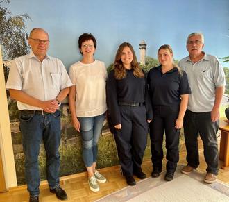 Es gratulierten Franziska Folmer (Mitte) neben Bürgermeister Uwe Weber (1. von rechts) auch Büroleiter Martin Hey (1. von links), die stellvertretende Fachbereichsleiterin Petra Jung (2. von links) und Kollegin Alicia Scholtes (2. von rechts) zum erfolgreichen Abschluss und zur Bestellung.