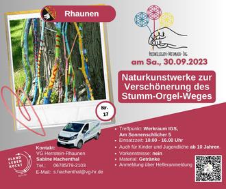 Das Jugendkunstmobil kommt nach Rhaunen. Gemeinsam werden aus Naturmaterialien Kunstwerke erstellt und im Anschluss damit eine Teilstrecke des Stumm-Orgel-Weges verschönert.
