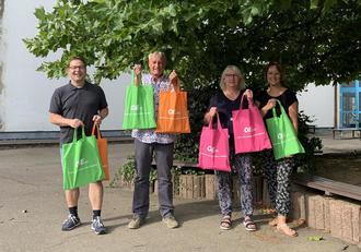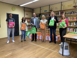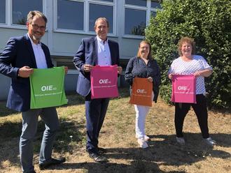 Still und leise haben fleißige Hände in den Sommerferien die Bücher für die diesjährige Schulbuchausleihe gepackt. Die OIE hat erneut auf nachhaltiges Material gesetzt und dafür knapp 4.500 bunte sogenannte Fairtrade-Stofftaschen zur Verfügung gestellt. Direkt zum Schulstart erfolgte dann die Ausgabe an die Schülerinnen und Schüler. Bei einigen Terminen vor Ort überzeugten sich die Verantwortlichen selbst und zeigten sich begeistert vom reibungslosen Ablauf. In der Grundschule Baumholder trafen sich Ann-Michelle Kullmann und Luca Heidrich, aus der Unternehmenskommunikation der OIE, mit Torsten Genenger sowie im Heinzenwies Gymnasium mit dem Kreisbeigeordneten Bruno Zimmer. In der Grundschule Idarwald nahm OIE Kommunalbetreuer Florian Schmidt den Termin mit Uwe Weber, Verbandgemeindebürgermeister Herrstein- Rhaunen, wahr und in der Grundschule Idar war OIE Vorstand Ulrich Gagneur mit Oberbürgermeister Frank Frühauf vor Ort.