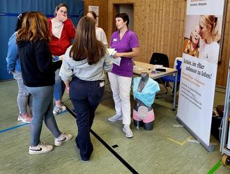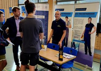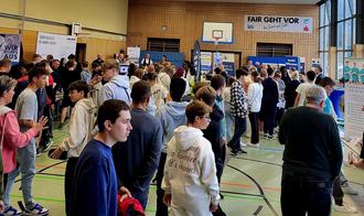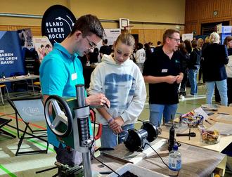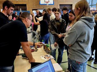 In der Schulturnhalle sowie der Mensa und im Außenbereich präsentierten 30 Unternehmen und Institutionen den Schülerinnen und Schülern der IGS zu wohnortnahe Ausbildungsmöglichkeiten und luden zur Interaktion ein. Groß war das Angebot Werkstoffe anzufassen, zu riechen, das handwerkliche Geschick auszuprobieren, in typische Arbeitsvorgänge reinzuschnuppern oder per Bildschirm Vorgänge zu steuern.