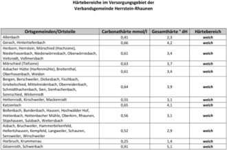 Die Trinkwasserhärte im Versorgungsgebiet der Verbandsgemeinde Herrstein-Rhaunen umfasst den Härtebereich 1. Näheres kann nachfolgender Liste entnommen werden.