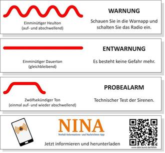 Ab 10:00 Uhr startet die Probealarmierung und gegen 10:45 Uhr erfolgt die Entwarnung.