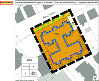Anlass der Aufstellung des vorhabenbezogenen Bebauungsplans „Rheinallee – Östlich der Bahnüberführung“ ist die Schaffung von Baurecht für die Errichtung eines Mehrfamilienhauses mit insgesamt 15 Wohneinheiten, bestehend aus zwei parallel platzierten Gebäuderiegeln, welche mittig durch einen Erschließungskörper mit Treppenhaus und Aufzug miteinander verbunden sind. Im beiliegenden, nicht maßstäblichen Lageplan ist der Geltungsbereich des vorhabenbezogenen Bebauungsplanes dargestellt. Der Plan hat keine Rechtswirkung und dient nur dem besseren Verständnis dieser Bekanntmachung.