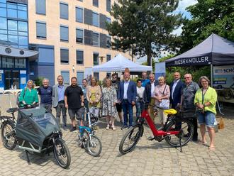 Der Kreisbeigeordnete Steffen Wolf (Mitte) eröffnete das Stadtradeln 2023 im Landkreis Mainz-Bingen vor dem Ingelheimer Kreishaus.