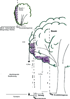 Der Rückschnitt muss in einer lichten Höhe von 2,25 m bündig bis zur Grundstücksgrenze erfolgen. Ein Überhang über diese Höhe hinaus ist nur dann zulässig, wenn hierbei ein Abstand von mindestens 0,50 m zur Fahrbahn eingehalten wird.