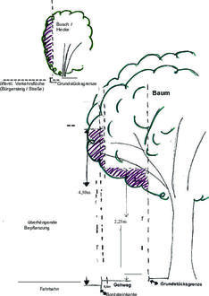 Der Rückschnitt muss in einer lichten Höhe von 2,25m bündig bis zur Grundstücksgrenze erfolgen. Ein Überhang über diese Höhe hinaus ist nur dann zulässig, wenn hierbei ein Abstand von mindesten 0,50m zur Fahrbahn eingehalten wird.