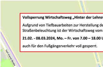 Aufgrund von Tiefbauarbeiten zur Herstellung der Straßenbeleuchtung ist der Wirtschaftsweg vom 21.02. - 08.03.2024, Mo. – Fr. von 7.00 – 18.00 Uhr, auch für den Fußgängerverkehr voll gesperrt.