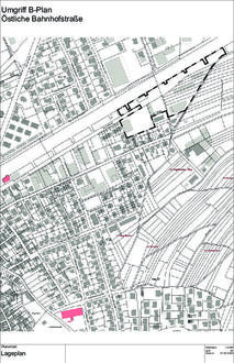 Die nachfolgende Skizze zeigt den Geltungsbereich des Bebauungsplans „Östliche Bahnhofstraße“. Sie dient der Übersicht und entfaltet keine Rechtskraft.
