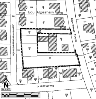 Der Geltungsbereich liegt im Süden von Gau-Algesheim westlich der Appenheimer Straße. Er grenzt im Westen an die Caprino-Veronese-Straße und im Süden an die Bebauung im Blätterweg an. Er schließt an den Geltungsbereich die rechtkräftigen Bebauungspläne „Blätterweg“ und „Appenheimer Straße/Layenmühle“ an. Der geplante Bebauungsplan umfasst die Flurstücke 22/5 (teilweise), 22/7, 22/8, 22/9, 22/10, 22/11 aus Flur 11. Die nachfolgende Skizze zeigt den Geltungsbereich des Bebauungsplanes. Sie dient der Übersicht und entfaltet keine Rechtswirkung.