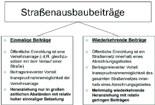 In der folgenden Gegenüberstellung sind noch einmal die wesentlichsten Unterschiede zwischen dem wiederkehrenden Ausbaubeitrag („wkB“) sowie der Erhebung des einmaligen Ausbaubeitrages dargestellt: