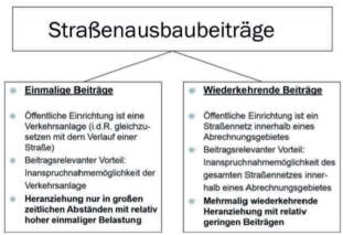 In der folgenden Gegenüberstellung sind noch einmal die wesentlichsten Unterschiede zwischen dem wiederkehrenden Ausbaubeitrag („wkB“) sowie der Erhebung des einmaligen Ausbaubeitrages dargestellt: