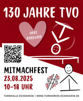 Bewegung, Spaß und Gemeinschaft - das erwartet Euch anlässlich des 130-jährigen Bestehens des Turnvereins Ockenheim. Hier möchten wir uns gerne mit unserem sportlichen Angebot präsentieren und laden Euch ganz herzlich in die Turnhalle des Turnvereins Ockenheim in der Mainzer Straße 79 ein. Wir starten um 10:00 Uhr und freuen uns auf zahlreiche Besucher.