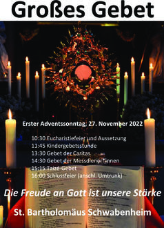 Am 1. Adventssonntag (27.11.) feiert die Pfarrei Schwabenheim den Tag des Großen Gebetes. Es steht unter dem Leitwort „Die Freude an Gott ist unsere Stärke.“ Am Ende der Eucharistiefeier um 10:30 Uhr wird das eucharistische Brot in der Monstranz ausgesetzt. Es folgt die Gebetsstunde der Kinder, zu der besonders die Erstkommunionkinder eingeladen sind. In der Mittagszeit ist Stille Anbetung in der Bartholomäuskirche. Für 13:30 Uhr lädt der AK Caritas zu einer thematischen Betstunde ein. Die Messdiener*innen der Pfarrei haben um 14:30 Uhr eine Gebetsstunde für Kinder und Jugendliche vorbereitet. Um 15:00 findet ein Taizégebet mit Liedern aus Taizé statt. Mit der Schlussfeier um 16:00 Uhr und einem Umtrunk und Imbiss im Christoph-Nebel-Haus endet der Festtag.