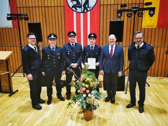 Wehrleiter Per Mayer ernannte Jaroslaw Dukielski zum Feuerwehrmann und Kai Hofmann zum Hauptfeuerwehrmann. Beide wurden für ihren Einsatz und ihr Engagement gewürdigt, was den Applaus der Anwesenden hervorrief.