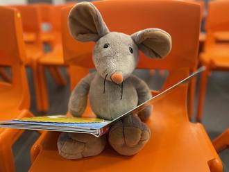 Bini-Maus freut sich auf die nächste Vorlesestunde.