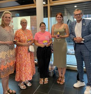 Zur großen Freude von Thomas Feser war auch das ehrenamtliche Vorleseteam der Bücherei vor Ort, sodass er den Vorleserinnen persönlich für ihr Engagement in der Leseförderung danken konnte. „Wie ich gehört habe, gab es in diesem Jahr auch ein Vorlesepicknick? Ohne Ihren Einsatz wären solche Aktionen überhaupt nicht möglich“, dankte der OB den Vorlesern Henrike Meurer, Sina Vetra, Julia Rohleder, Margit Rüdel, Fatma Yilmaz und Martin Wegner sowie den Mitarbeiterinnen vom Lernzentrum der VHS Bingen, Tamara Teichmann und Nicole Simon.
