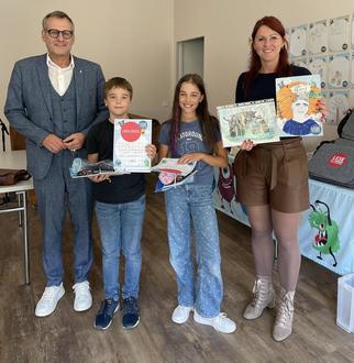 Oberbürgermeister Thomas Feser und Büchereileiterin Julia Löffler gratulieren Luca Blaumoser und Azra Hasine Erkan. Foto: Stadt Bingen