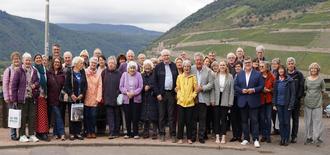 Nach dem Eintrag ins Goldene Buch und dem Gruppenbild mit Blick ins Mittelrheintal stand für die Gäste das Mittagessen beim Bauer Schorsch und eine Planwagenfahrt mit Weinprobe auf dem Programm.