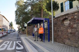Oberbürgermeister Thomas Feser und Michael Wolff (Abteilung Straßenbau der Stadtwerke) am neuen Fahrgastunterstand Haltestelle Winfriedstraße.