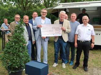 Oberbürgermeister Thomas Feser (5. v. li.) übergibt den Spendscheck an den Angelsportverein Bingen 1924.