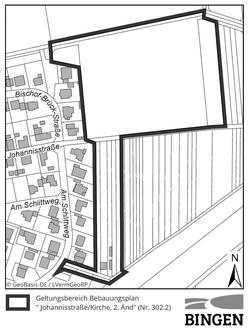 Der räumliche Geltungsbereich des Bebauungsplanes „Johannisstraße/Kirche, 2. Änderung“ liegt am östlichen Ortsrand von Bingen-Büdesheim und wird nördlich umgrenzt vom Friedhof und südlich von der ehemaligen B9. Der geplante Bebauungsplan ist aus dem nachstehenden Übersichtsplan ersichtlich und umfasst das folgende Grundstück der Gemarkung Büdesheim: