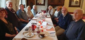 Das 10-jährige Jubiläumstreffen stand unter einem besonderen Stern. Die Schatzmeisterin Ruth Vogel erlitt im Januar einen Schlaganfall und ist seitdem stationär. Doch sie hat sich so zusammen genommen, dass sie unbedingt bei diesem Treffen dabei sein wollte. Also kam sie mit dem Rollstuhltaxi. Und sie schaffte es sogar gemeinsam mit Marion Sloykowski, den Sketch „Tassen und Kännchen“ vorzutragen. Eine starke Leistung in dieser Situation! Das war das Highlight dieses besonderen Beisammenseins. Marion Sloykowski und Michael Dietz trugen dann auch die Sage „Die Rosse vom Roßstein“ vor, eine Geschichte, die Ruth Vogel für die sich in Arbeit befindliche Lesung „Schifffahrt auf dem Trockenen“, also an Land, geschrieben und mit eigenen Fotos bebildert hatte.