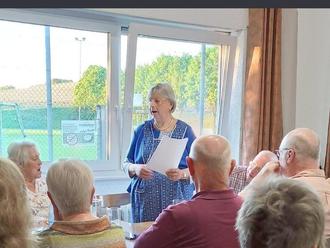 Irmgard Pfeifer und Thomas Hartmann erzählten Geschichten, Lieder und Gedichte über die Dromersheimer Mundart. Die Texte kamen bei den Zuhörern und Zuhörerinnen gut an und ernteten großen Applaus. Besonders die Geschichte vom Eiswein und das Loblied auf die „Scherz“ (Schürze), die für die Frauen aus alter Zeit unverzichtbar waren und alltäglich benutzt wurden, sorgten für gute Stimmung.