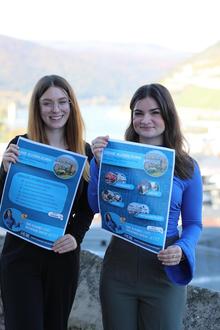 Die Auszubildenden Lisa Scheibe (l.) und Esmanur Chatziametoglou präsentieren die von ihnen gestaltete Plakatreihe.