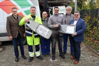 Präsentieren stolz die alten (links) und neuen Leuchtenköpfe: (v.l.n.r.) Werkleiter Marco Mohr, Stadtwerkemitarbeiter Alexander Klein, Hanns Brun-ner, Stefan Lauer, Jörg Kundel (alle EWR Netze) und Bürgermeister Ulrich Mönch