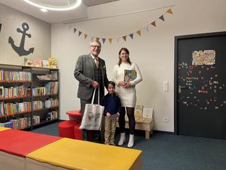 Natürlich ließ es sich der Oberbürgermeister nicht nehmen, ihm noch ein zusätzliches Geschenk mitzubringen: eine Tasche mit Lesemaus und Büchern. „Du bist ein richtiger Glückpilz und wurdest aus 8.000 Karten gezogen“, beglückwünschte Feser den Jungen. Zur Gewinnübergabe war auch Johanns Familie mitgekommen, die dem Stadtoberhaupt ihre Freude über die Bücherei rückmeldete: „Das ist so ein schöner Ort für Familien hier. Wir kommen immer extra aus Gau-Algesheim hergefahren, weil die Bücherei so viel zu bieten hat.“ Nach dem Büchereibesuch ging es für die Familie direkt in die nächste Buchhandlung, denn Johann hatte sich selbstverständlich schon ein neues Buch ausgesucht.