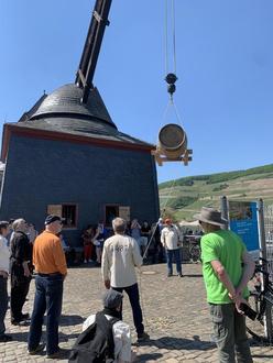 Die Kranmägde und Kranknechte der Binger Denkmalgesellschaft, alle geschulte Kranführerinnen und Kranführer, führen am Welterbetag die Verladung eines Weinfasses mit der mittelalterlichen Technik vor. Sie geben auch einen Einblick in die faszinierende Krantechnik des Mittelalters und erläutern die Historie des Kranes.