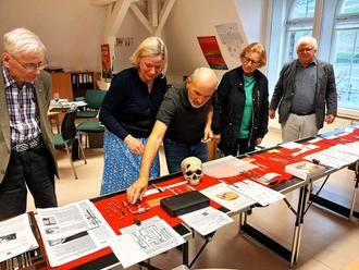 Mitglieder des Freundeskreises betrachten die gesammelten Exponate zur Präsentation des Binger Ärztebestecks im Museum am Strom. Das Bild zeigt von links: Günter Hartmann, Annette Hammel, Klaus Becker, Claudia Grünewald und Thomas Tüschen.