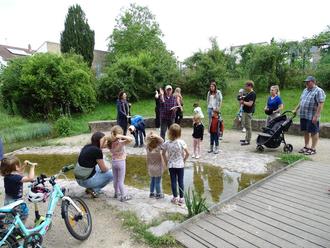 Anschließend ging es am Entenbachteich weiter, wo die Kinder erraten sollten, welche Tiere hier heimisch sind. Sie konnten selbst den Weg vom Laich zum Frosch nachstellen oder erfuhren, welche Vögel und Insekten es hier noch gibt. Am Ende wurden dann passend zum Entenbach Frösche aus Papier gebastelt und Tierbilder ausgemalt.