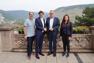 Rundum zufrieden mit dem ersten persönlichen Treffen: (v.l.n.r.) Dezernent Sebastian Hamann, Bildungsminister Sven Teuber, Oberbürgermeister Thomas Feser und Christina Dickescheid, Abteilungsleiterin Schulen bei der Stadtverwaltung Bingen