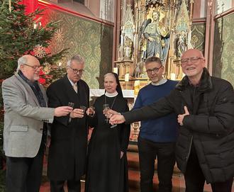 Rainer Lotz und Prof. Dr. Manfred Psiorz von der Rochusbruderschaft, Äbtistin Sr. Katharina Drouvé, Pfarrer Markus Lerchl, Dr. Stefan Blaesius vom Binger Weinsenat e.V.