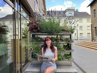 Der MoBiGa (mobile, vertikale Garten) vor der Bücherei lädt zum Sitzen und Verweilen ein.