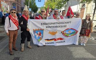 Oberbürgermeister Feser hatte zum Winzerfest seinen Amtsbruder Durmus Deniz und Mitglieder des Kreis- und Stadtrates eingeladen. Mit dabei auch Hamdi MAHIR, Vorsitzender des Vereins der Partnerstädte, der auch als Übersetzer tätig war. Die Betreuung der Gäste übernahm der Freundeskreis Bingen-Anamur. Beim offiziellen Empfang auf Burg Klopp erfolgte der Eintrag ins Goldene Buch. Die anwesenden Gäste aus Politik, Wirtschaft und Tourismus konnten die Bilder eines Malwettbewerbs bewundern. Ein Gegenpart zum Winzerfesttrubel war die Wanderung im Binger Wald auf dem Premium-Rundweg durch die „Steckeschlääferklamm“, wo die Gäste die Baumgeister (geschnitzte Gesichter) zählen mussten. Anschließend gab es für jeden eine Urkunde mit Wegplakette. Höhepunkt des Delegationsbesuches war die Teilnahme am Winzerfestumzug. Dazu hatten die Gäste zwei Originaltrachten, Banner und Fahnen mitgebracht. Der Freundeskreis hatte einen Handkarren ausstaffiert und verteilte mehr als 400 Bananen an die vielen Zuschauer, die das sonnige Wetter an diesem Sonntag zu einem Besuch in Bingen nutzten.