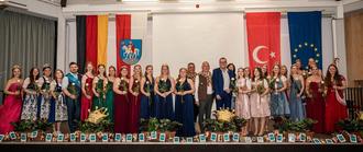 Oberbürgermeister Thomas Feser, die Weinmajestäten und Teilnehmer der türkischen Delegation stellten sich zum Gruppenbild.
